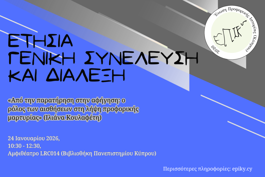 Ενημερώνουμε ότι η ετήσια Γενική Συνέλευση της Ένωσης Προφορικής Ιστορίας Κύπρου θα πραγματοποιηθεί στις 24 Ιανουαρίου 2026, από τις 10:30 μέχρι τις 12:30, στο Αμφιθέατρο LRC 014 της Βιβλιοθήκης του Πανεπιστημίου Κύπρου.